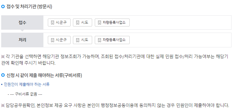 인터넷 신청이 번거롭거나 여의치 않은 경우에는 처리기관을 직접 방문하여 처리 할 수도 있습니다. 해당지역의 시군구, 시도, 차량등록사업소 위치는 여기에서 확인하실 수 있습니다.