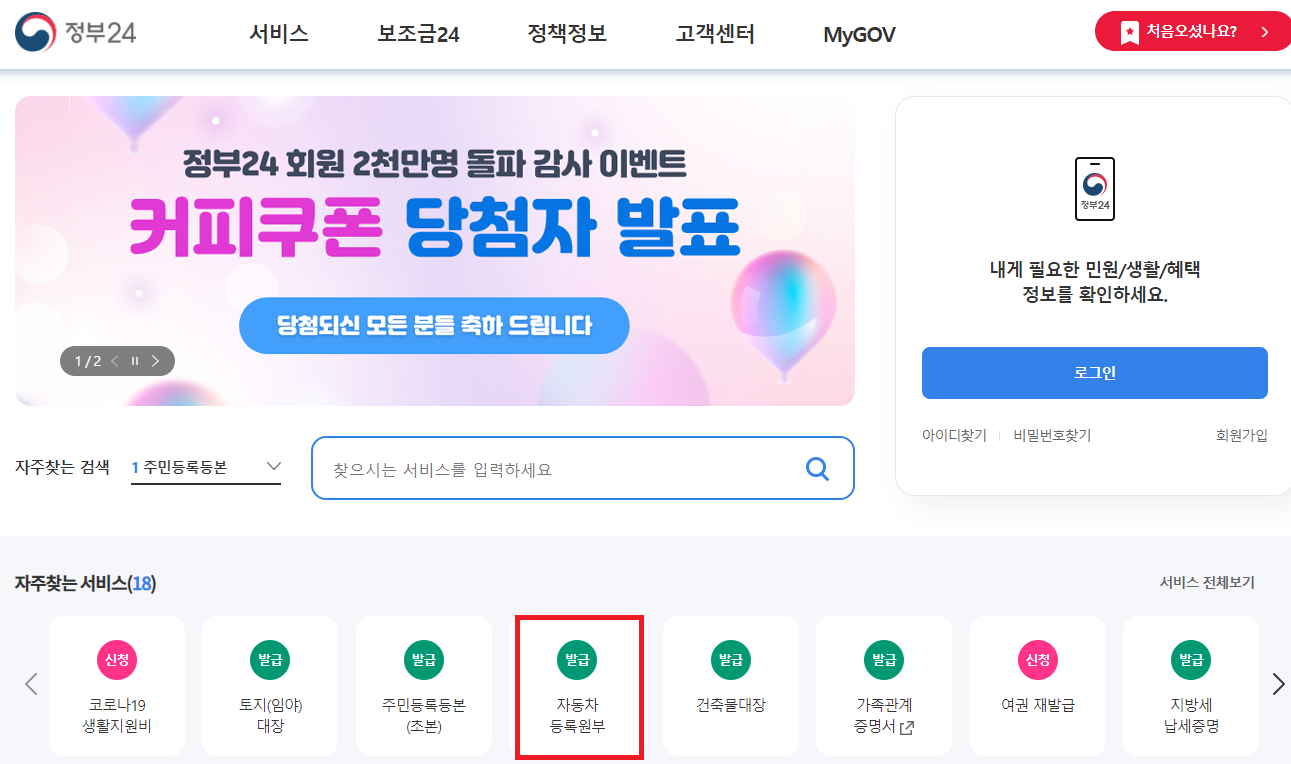 정부24 홈페이지로 이동을 하게 되면 자동차등록원부 발급 메뉴를 찾아야 합니다. 다행스럽게도 많은 분들이 찾는 서비스이기 때문에 메인화면에 자주 찾는 18개 서비스 중에 하나로 위치하고 있습니다.
