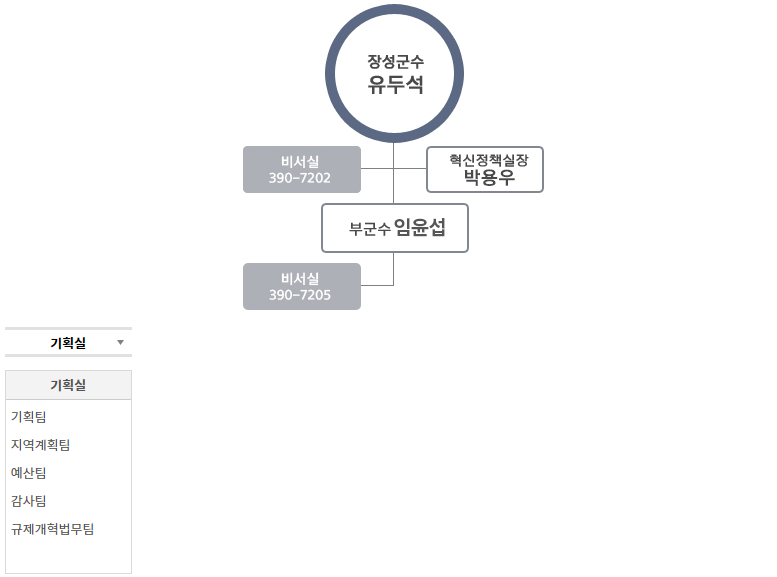 장성군청은 군수 아래에 부군수가 있으며 그 아래의 조직으로는 기획실, 소통정보실, 총무과, 주민복지과, 문화관광과, 환경위생과, 민원봉사과 등의 부서가 있습니다. 장성군청 조직도는 현재 정비중이어서 아래 링크를 통해 확인하시는 것이 좋습니다.