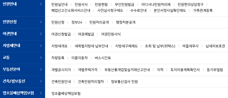 민원 관련 세부 메뉴들을 살펴보면 다음과 같습니다. 또한 전화번호 안내, 업무 및 직원검색, 청사안내, 오시는길 안내 등의 바로가기 메뉴를 알아보겠습니다.