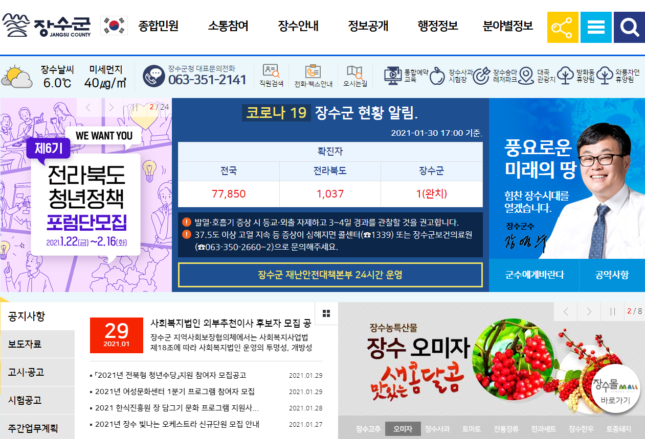 장수군청 홈페이지의 메인 화면입니다. 많은 업무를 수행하는 군청이기 때문에 아주 다양한 메뉴들을 확인하실 수 있습니다. 주요 메뉴로는 종합민원, 소통참여, 장수안내, 정보공개, 행정정보, 분야별정보의 메뉴가 있습니다.