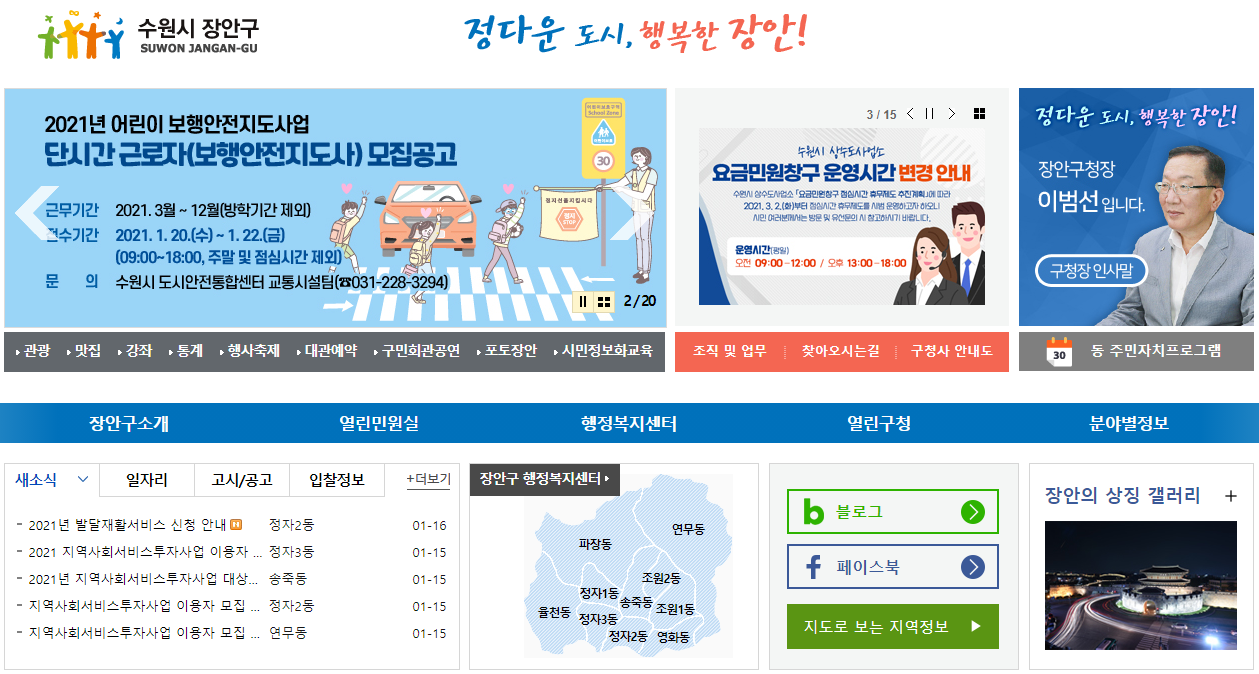 장안구청을 자세히 살펴보기 위해서는 장안구청 홈페이지로 접속하시는 것이 가장 빠른 방법입니다. 포털사이트에서 장안구청을 검색하시면 간편하게 접속을 하실 수가 있습니다.
