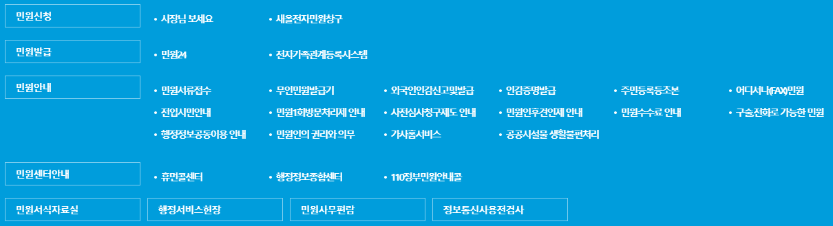 민원 관련 세부 메뉴들을 살펴보면 다음과 같습니다. 또한 전화번호 안내, 업무 및 직원검색, 조직도, 청사안내 등의 바로가기 메뉴를 알아보겠습니다.