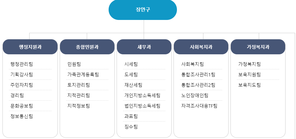 장안구청은 구청장 아래에 행정지원과, 종합민원과, 세무과, 사회복지과, 가정복지과 등의 부서가 있습니다.