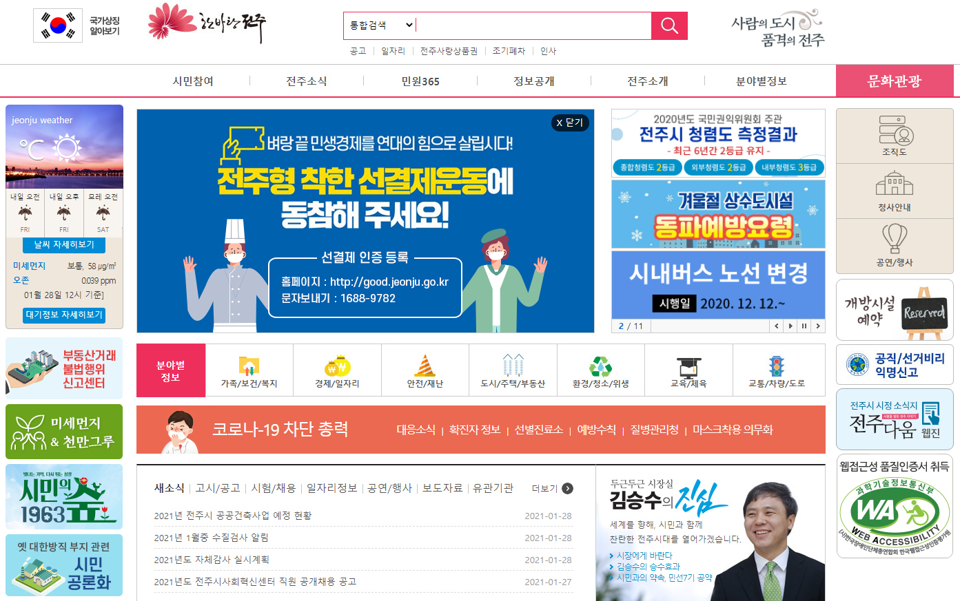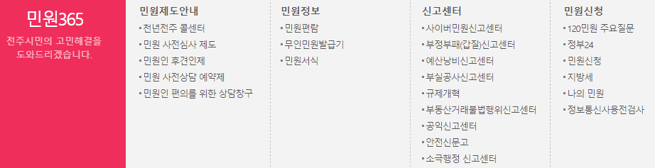 전주시청 홈페이지의 메인 화면입니다. 많은 업무를 수행하는 시청이기 때문에 아주 다양한 메뉴들을 확인하실 수 있습니다. 주요 메뉴로는 시민참여, 전주소식, 민원365, 정보공개, 전주소개 등의 메뉴가 있습니다.