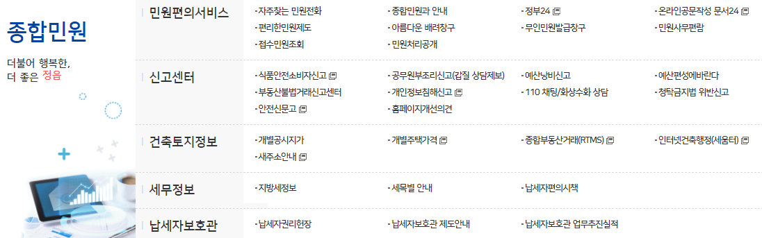 - 자주찾는 민원전화- 종합민원과 안내- 정부24- 온라인공문작성 문서24- 편리한민원제도- 아름다운 배려창구- 무인민원발급창구- 민원사무편람- 접수민원조회- 민원처리공개신고센터