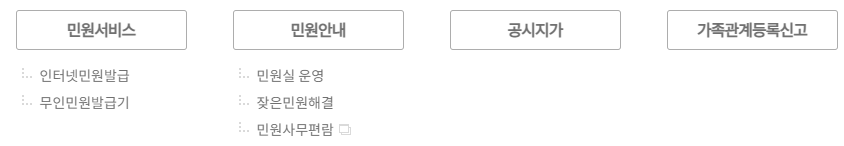 민원 관련 세부 메뉴들을 살펴보면 다음과 같습니다. 또한 전화번호 안내, 업무 및 직원검색, 조직도, 청사안내 등의 바로가기 메뉴를 알아보겠습니다.