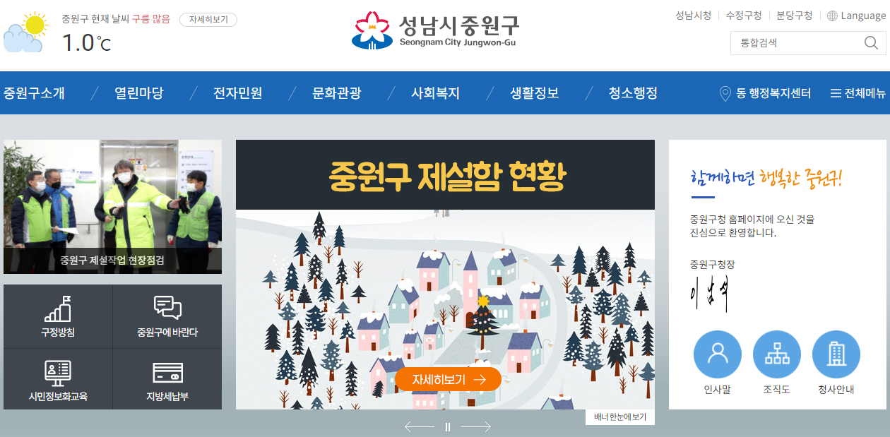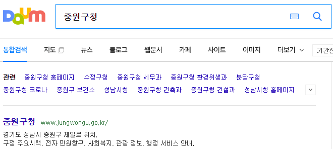 중원구청을 자세히 살펴보기 위해서는 중원구청 홈페이지로 접속하시는 것이 가장 빠른 방법입니다. 포털사이트에서 중원구청을 검색하시면 간편하게 접속을 하실 수가 있습니다.