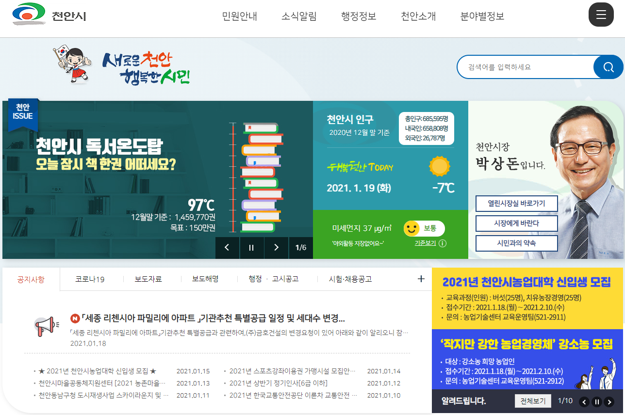 천안시청 홈페이지의 메인 화면입니다. 많은 업무를 수행하는 시청이기 때문에 아주 다양한 메뉴들을 확인하실 수 있습니다. 주요 메뉴로는 민원안내, 소식알림, 행정정보, 천안소개, 분야별정보의 메뉴가 있습니다.