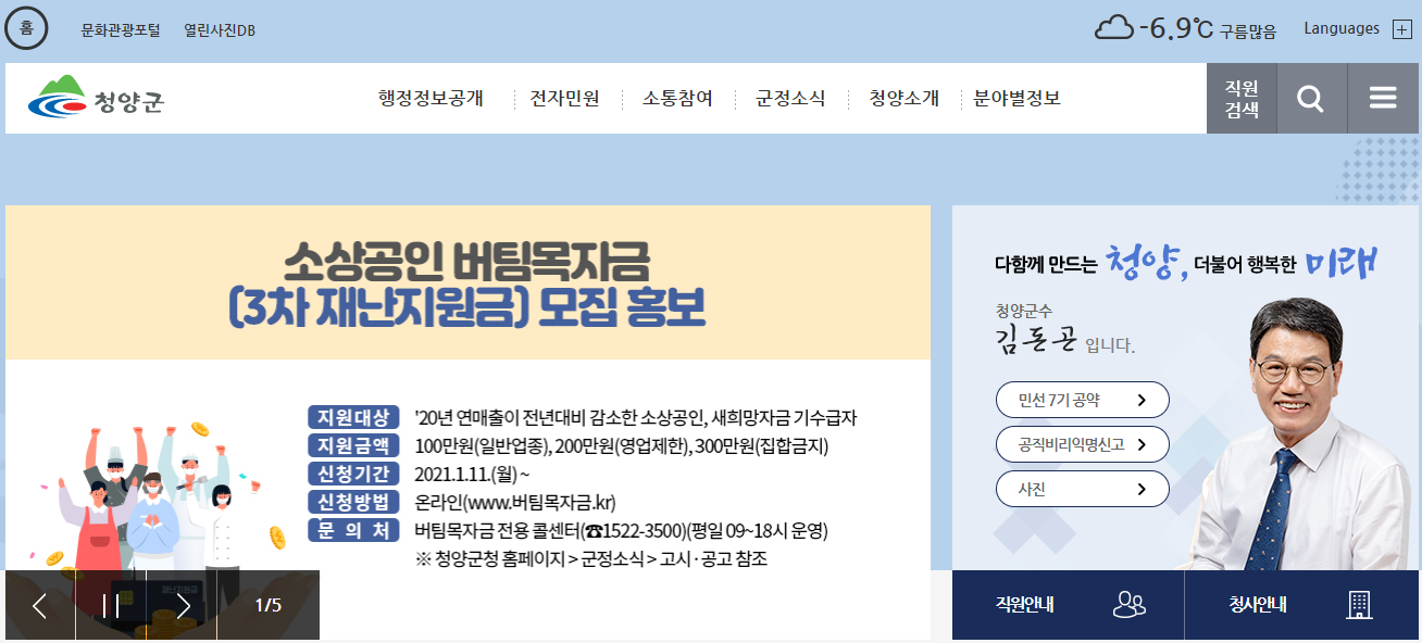 청양군청 홈페이지의 메인 화면입니다. 많은 업무를 수행하는 군청이기 때문에 아주 다양한 메뉴들을 확인하실 수 있습니다. 주요 메뉴로는 민원창구, 구민참여, 행정정보, 우리구소개, 분야별정보, 문화관광의 메뉴가 있습니다.