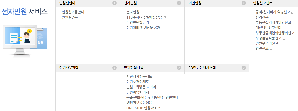 민원 관련 세부 메뉴들을 살펴보면 다음과 같습니다. 또한 전화번호 안내, 업무 및 직원검색, 조직도, 청사안내 등의 바로가기 메뉴를 알아보겠습니다.