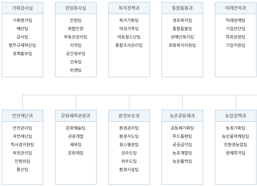 청양군청은 군수 아래에 부군수가 있으며 그 아래의 조직으로는 기획감사실, 민원봉사실, 복지정책과, 통합돌봄과, 미래전략과 등의 부서가 있습니다. 전체 조직도를 보시려면 아래를 참고해 주세요.