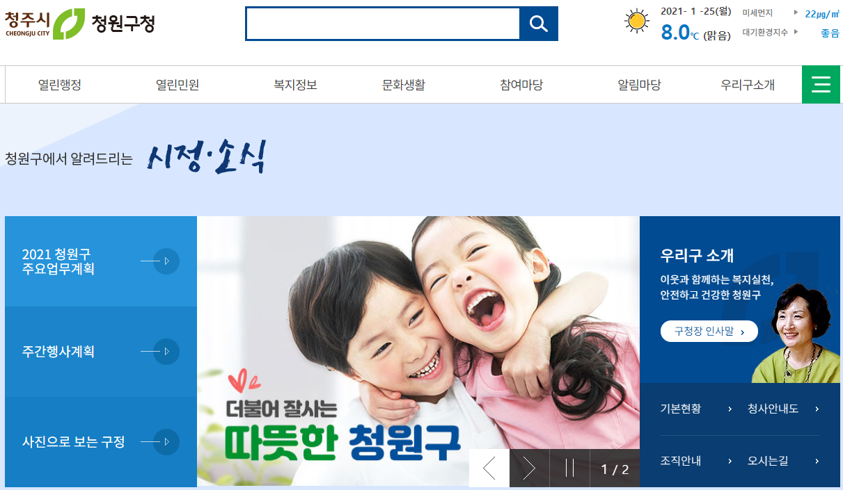 청원구청을 자세히 살펴보기 위해서는 청원구청 홈페이지로 접속하시는 것이 가장 빠른 방법입니다. 포털사이트에서 청원구청을 검색하시면 간편하게 접속을 하실 수가 있습니다.