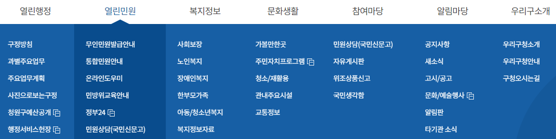 청원구청 홈페이지의 메인 화면입니다. 많은 업무를 수행하는 구청이기 때문에 아주 다양한 메뉴들을 확인하실 수 있습니다. 주요 메뉴로는 열린행정, 열린민원 복지정보, 문화생활, 참여마당, 알림마당의 메뉴가 있습니다.