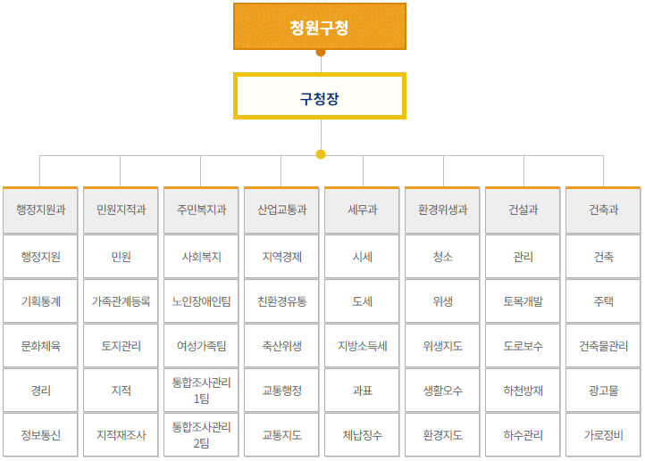청원구청은 청원구청장 아래에 행정지원과, 민원지적과, 주민복지과, 산업교통과, 세무과, 환경위생과, 건설과, 건축과 등의 부서가 있습니다.