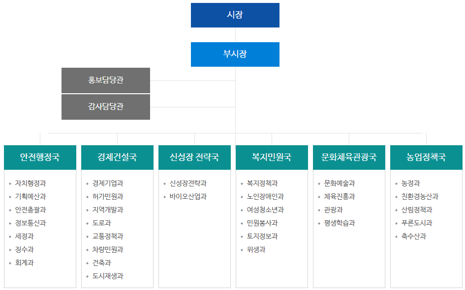 충주시청은 시장 아래에 부시장이 있으며 그 아래의 조직으로는 안전행정국, 경제건설국, 신성장전략국, 복지민원국, 문화체육관광국, 농업정책국 등의 부서가 있습니다.