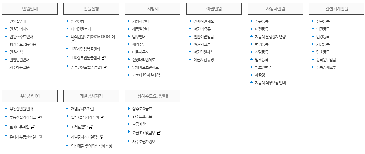 민원 관련 세부 메뉴들을 살펴보면 다음과 같습니다. 또한 전화번호 안내, 업무 및 직원검색, 조직도, 청사안내 등의 바로가기 메뉴를 알아보겠습니다.