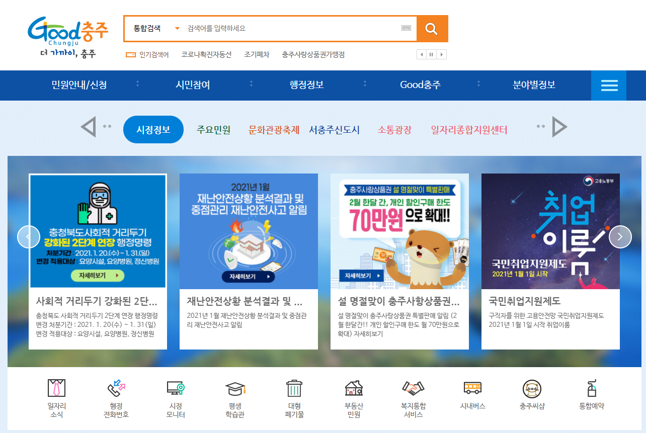 충주시청을 자세히 살펴보기 위해서는 충주시청 홈페이지로 접속하시는 것이 가장 빠른 방법입니다. 포털사이트에서 “충주시청”을 검색하시면 간편하게 접속을 하실 수가 있습니다.