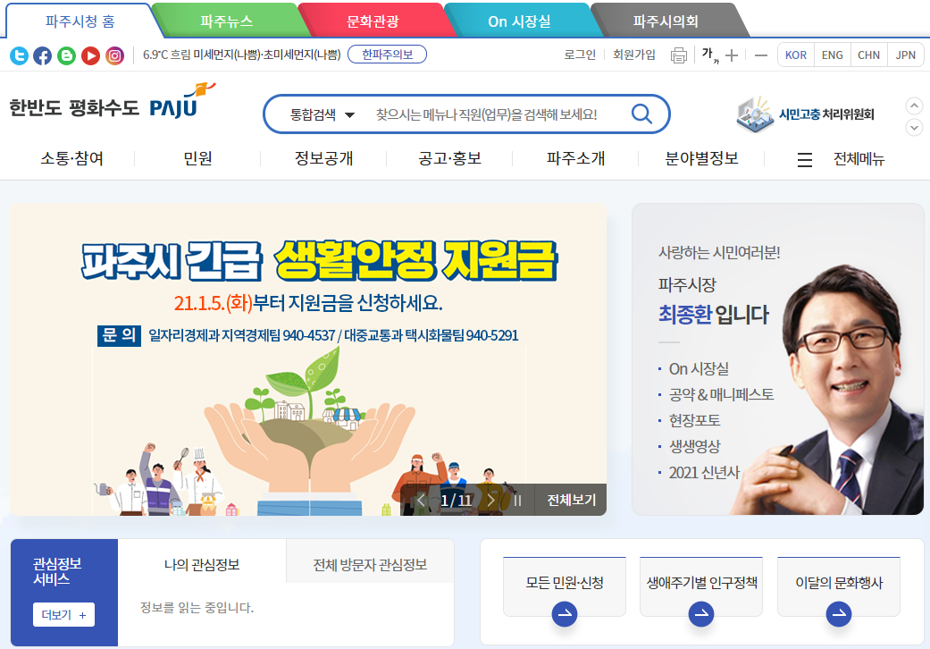 파주시청 홈페이지의 메인 화면입니다. 많은 업무를 수행하는 시청이기 때문에 아주 다양한 메뉴들을 확인하실 수 있습니다. 주요 메뉴로는 민원창구, 구민참여, 행정정보, 우리구소개, 분야별정보, 문화관광의 메뉴가 있습니다.