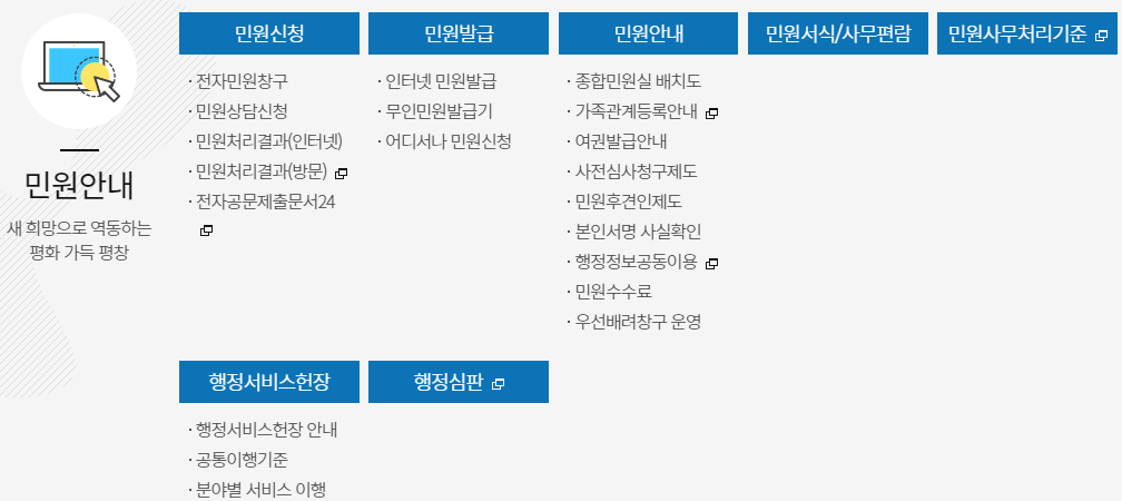 1 사회적약자 우선배려창구2 민원접수, 등·초본, 인감, 본인서명확인서3 외국인 사실증명4 여권신청, 민원1회방문5 도로명주소6 부동산 실거래 신고 및 검인, 공시지가7 부동산종합공부8 토지분할·합병·지목변경, 지적재조사9 지적측량 신청10 취득세·등록면허세, 지방세 납세증명11 자동차 등록 및 과태료12 지방소득세(개인·법인)