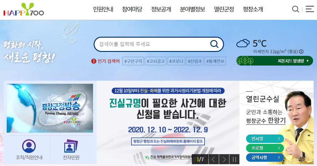 평창군청을 자세히 살펴보기 위해서는 평창군청 홈페이지로 접속하시는 것이 가장 빠른 방법입니다. 포털사이트에서 평창군청을 검색하시면 간편하게 접속을 하실 수가 있습니다.