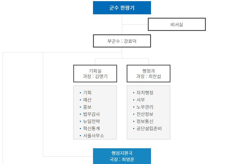 평창군청은 군수 아래에 부군수가 있으며 그 아래의 조직으로는 올림픽유산과, 복지정책과, 가족복지과, 민원과, 재무과, 교육체육과 등의 부서가 있습니다.