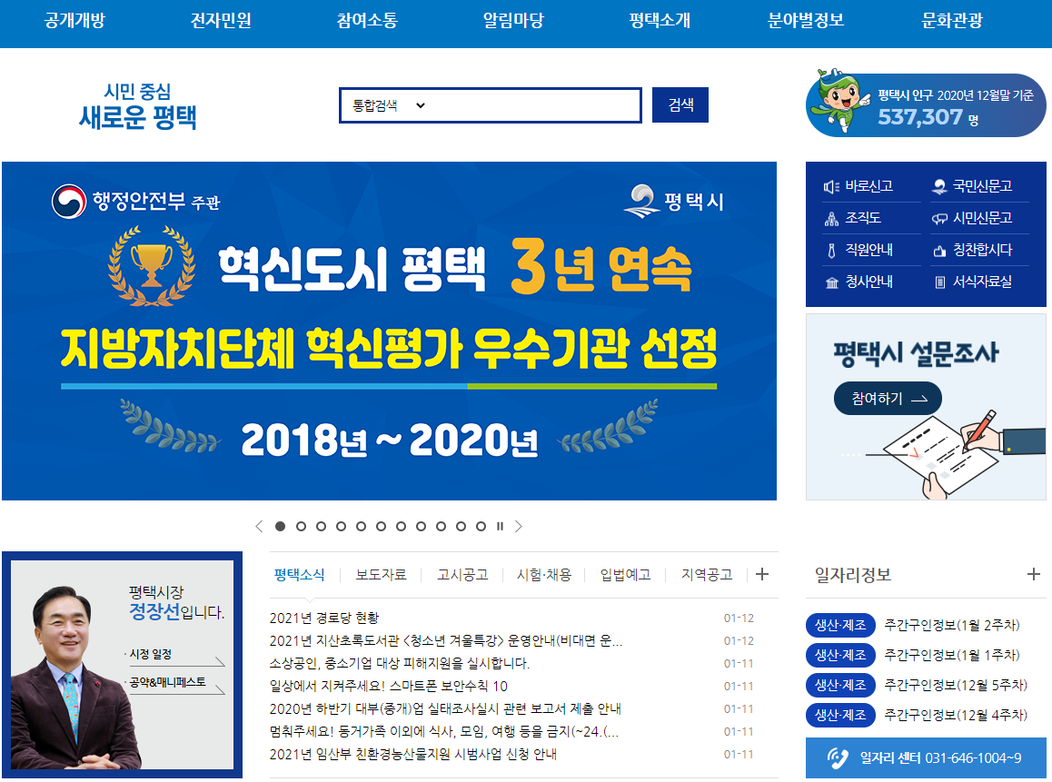 평택시청을 자세히 살펴보기 위해서는 평택시청 홈페이지로 접속하시는 것이 가장 빠른 방법입니다. 포털사이트에서 평택시청을 검색하시면 간편하게 접속을 하실 수가 있습니다.