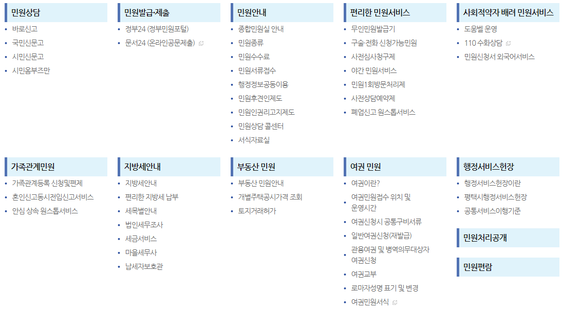민원 관련 세부 메뉴들을 살펴보면 다음과 같습니다. 또한 전화번호 안내, 업무 및 직원검색, 조직도, 청사안내 등의 바로가기 메뉴를 알아보겠습니다.