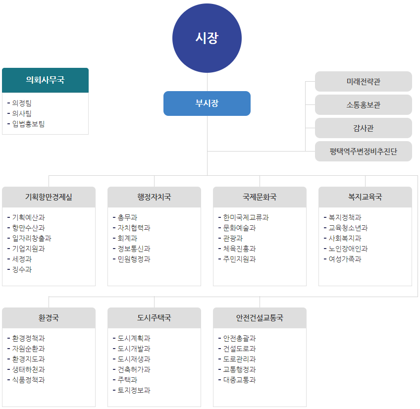 평택시청은 시장 아래에 부시장이 있으며 그 아래의 조직으로는 기획항만경제실, 행정자치국, 국제문화국, 복지교육국, 환경국, 도시주택국, 안전건설교통국 등의 부서가 있습니다.