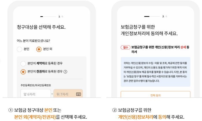 보험금 청구대상 본인 또는 본인 외(계약자/친권자)를 선택하고, 보험금 청구를 위한 개인정보처리에 동의합니다.