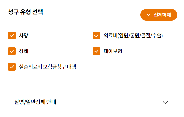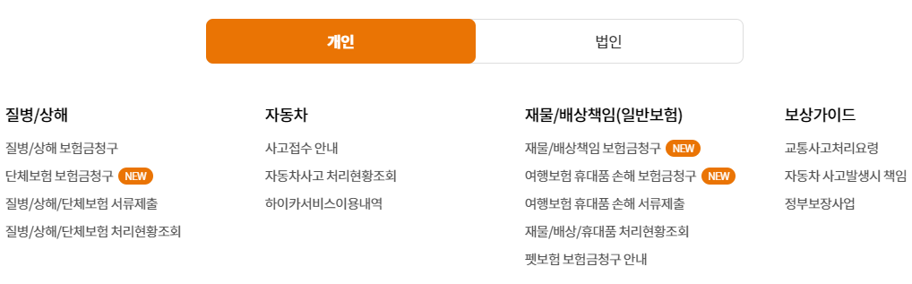 - 질병/상해 : 질병/상해 보험금청구, 단체보험금 청구, 질병/상해/단체보험 서류제출, 질병/상해/단체보험 처리현황조회