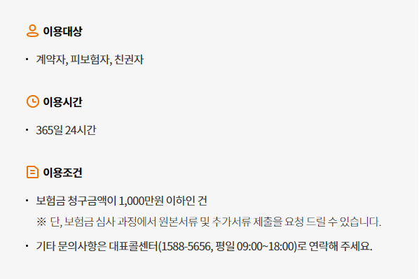 현대해상 보험금 청구의 이용대상은 계약자, 피보험자 그리고 친권자 입니다. 이용시간은 365일 24시간 이용이 가능합니다. 이용조건은 보험금 청구금액이 1,000만원 이하여야 합니다.