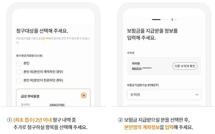 (최처 접수) 2년 이내 청구 내역 중 추가로 청구할 항목을 선택하고, 보험금을 지급받으실 분을 선택한 다음, 필요 내용을 입력합니다.