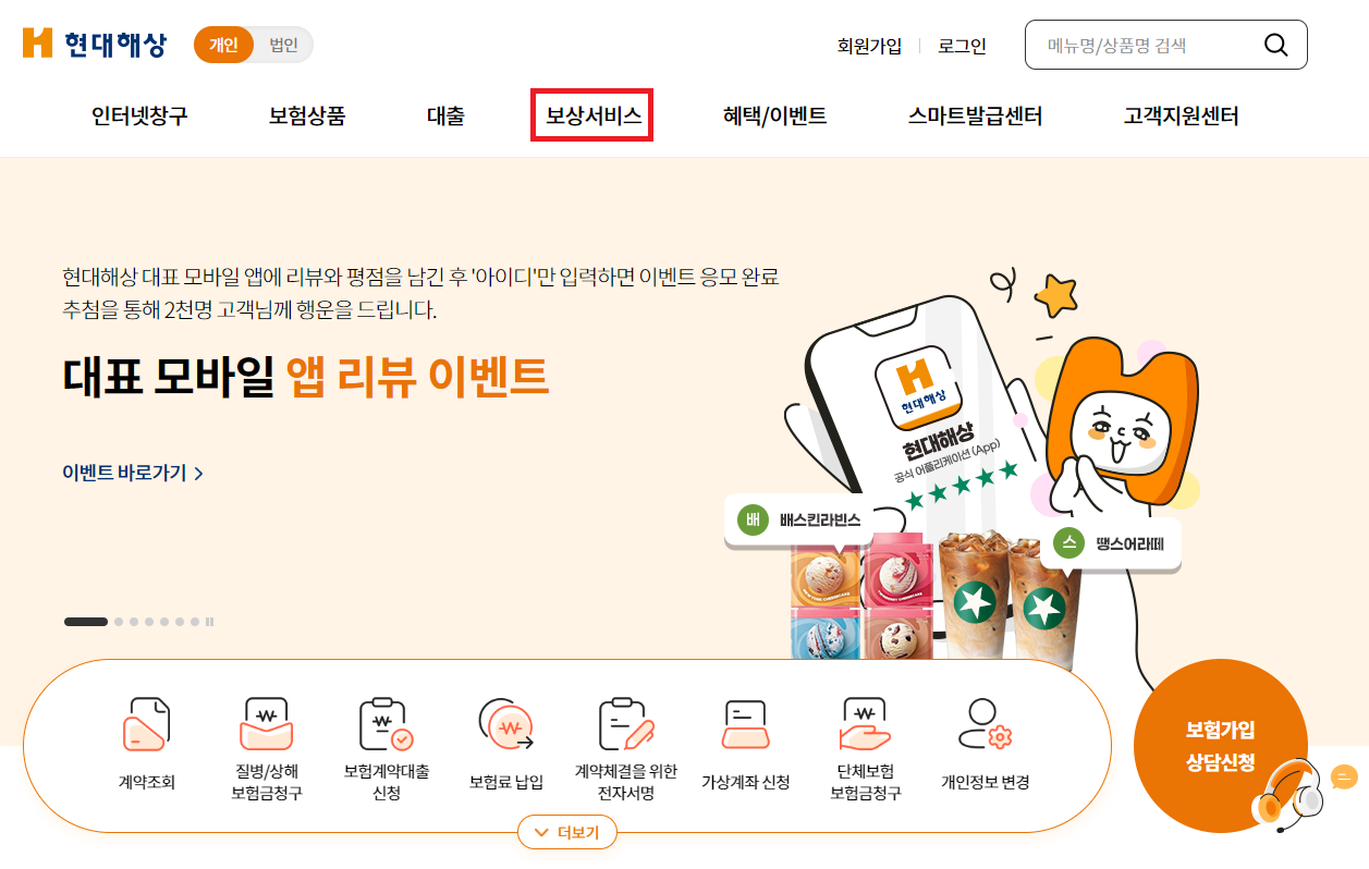 현대해상 홈페이지에서 보상서비스 메뉴를 선택하면 아래와 같은 항목이 나오게 됩니다. 대부분의 경우에는 질병/상해 보험금 청구를 하는 경우가 많습니다.