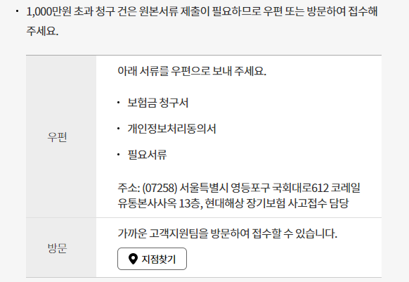 1,000만원을 초과하는 청구건에 대해서는 원본서류 제출이 필요하기 때문에 우편 또는 방문 접수가 필요합니다. 보험금 청구서, 개인정보처리동의서, 필요서류를 지참하여야 합니다.