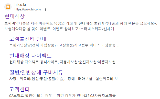 검색엔진마다 조금은 다르겠지만 화면을 아래로 내려서 아래와 같은 사이트 검색 결과가 보여야 대표홈페이지로 접속을 할 수 있습니다. 여기를 선택하면 간편하게 현대해상의 대표 홈페이지 www.hi.co.kr 로 접속이 가능합니다.