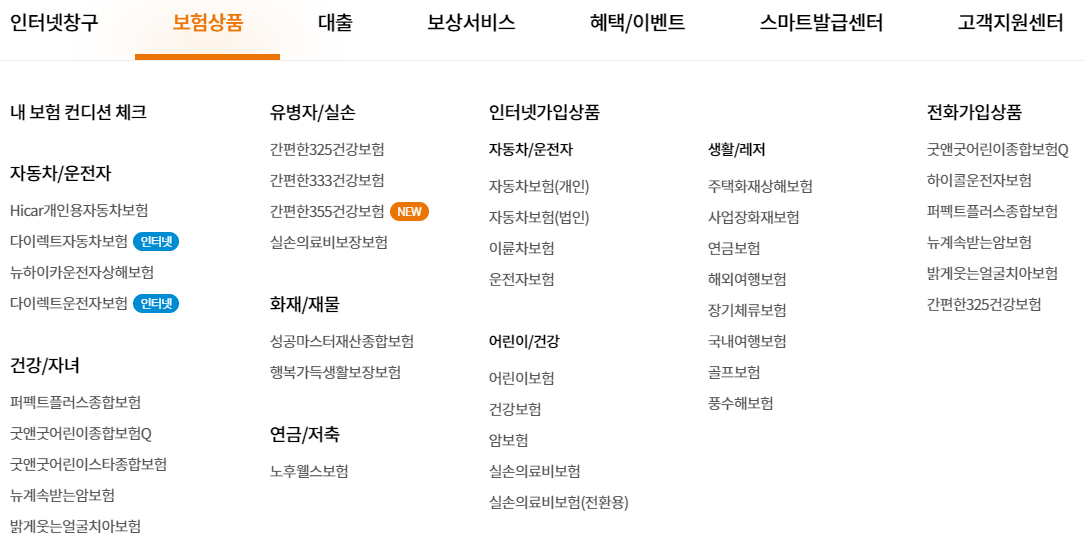 내 보험 컨디션 체크, 자동차/운전자, 유병자/실손, 화재/재물, 연금/저축, 어린이/건강, 생활/레저 등이 있습니다.