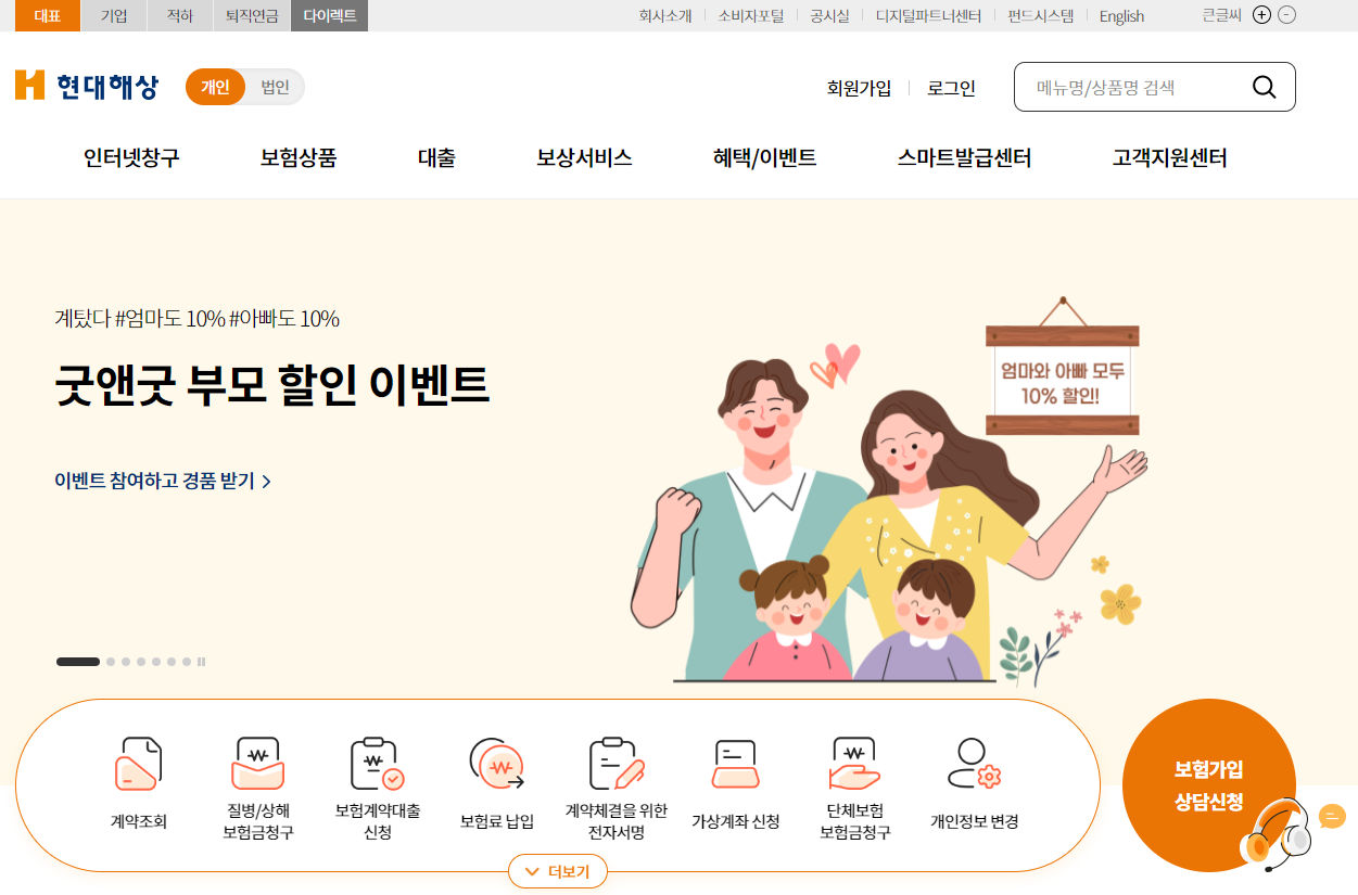 현대해상 홈페이지로 접속을 하면 아래와 같은 메인화면이 나오게 됩니다. 상단에는 인터넷창구, 보험상품, 대출, 보상서비스, 혜택/다이렉트, 스마트발급센터, 고객지원센터의 메뉴가 있습니다.