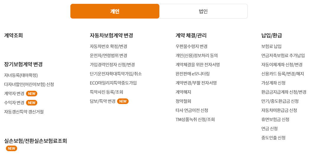 - 장기보험계야변경 : 자녀등록, 다자녀할인 신청, 계약자변경, 수익자 변경, 자동갱신특약 갱신거절
