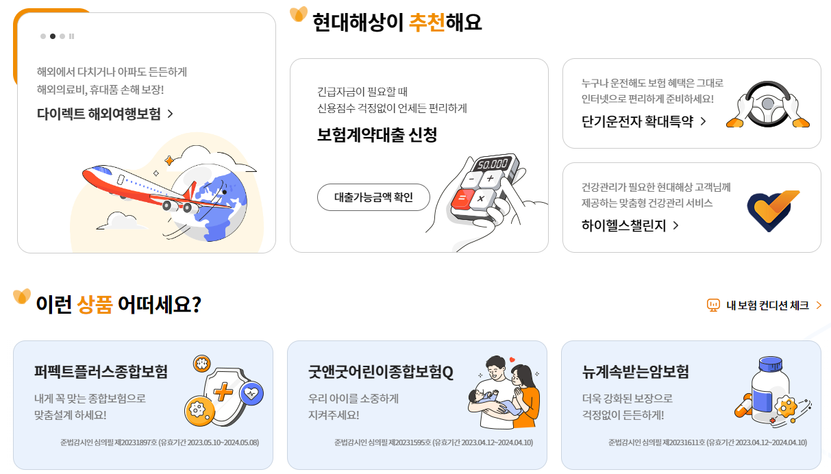 현대해상 메인화면에서는 인기있는 상품을 먼저 볼 수 있습니다. 다이렉트 해외여행보험, 보험계약대출신청, 단기운전자 확대특약, 하이헬스챌린지, 퍼펙트플러스종합보험, 굿앤굿어린이종합보험, 뉴계속받는암보험 등이 있습니다.