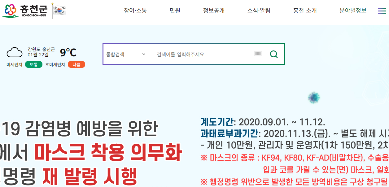 홍천군청 홈페이지의 메인 화면입니다. 많은 업무를 수행하는 군청이기 때문에 아주 다양한 메뉴들을 확인하실 수 있습니다. 주요 메뉴로는 참여, 소통, 민원, 정보공개, 소식, 알림, 홍천소개의 메뉴가 있습니다.