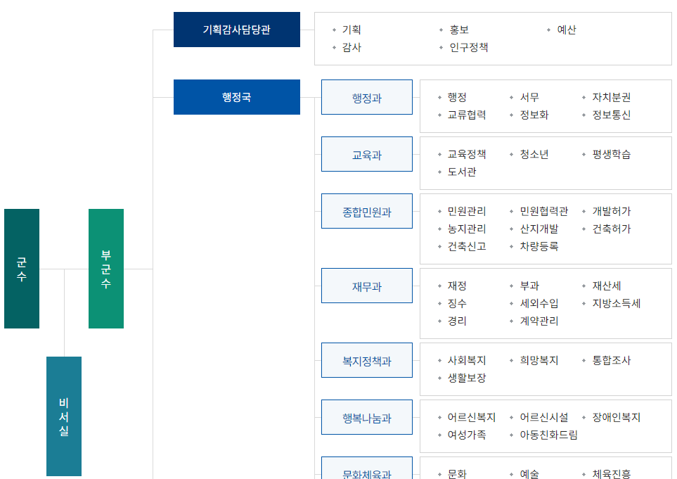 홍천군청은 군수 아래에 부군수가 있으며 그 아래의 조직으로는 행정과, 교육과, 종합민원과, 재무과, 복지정책과, 행복나눔과 등의 부서가 있습니다.