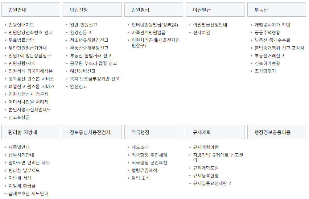 민원 관련 세부 메뉴들을 살펴보면 다음과 같습니다. 또한 전화번호 안내, 업무 및 직원검색, 조직도, 청사안내 등의 바로가기 메뉴를 알아보겠습니다.