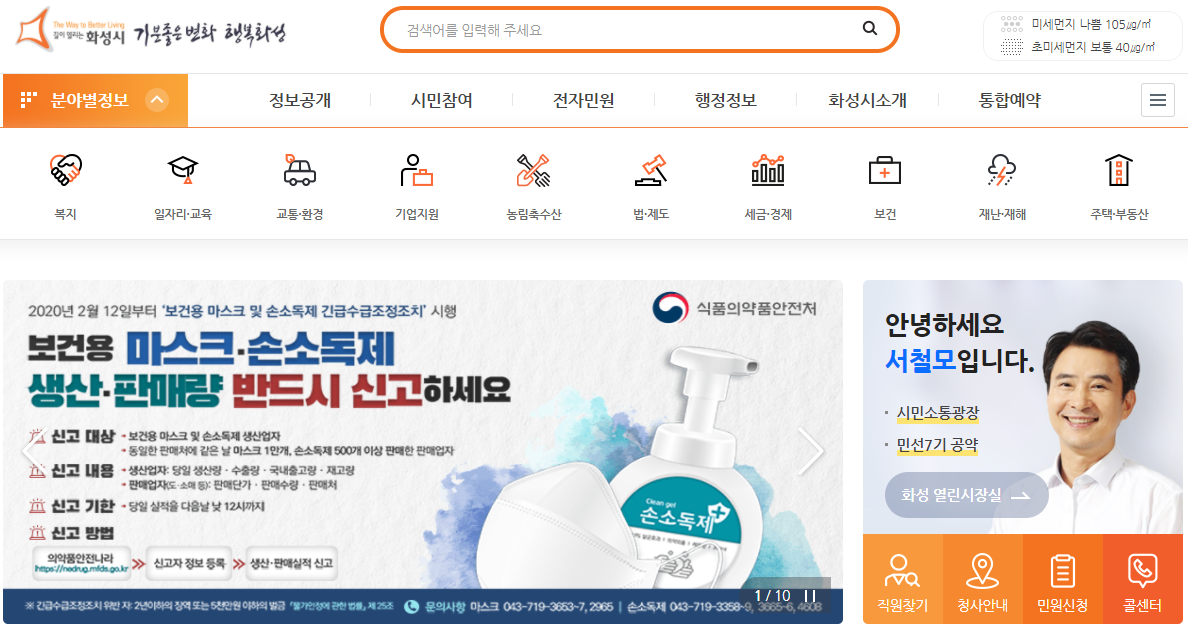 화성시청 홈페이지의 메인 화면입니다. 많은 업무를 수행하는 시청이기 때문에 아주 다양한 메뉴들을 확인하실 수 있습니다. 주요 메뉴로는 정보공개, 시민참여, 전자민원, 행정정보, 화성시소개, 통합예약의 메뉴가 있습니다.