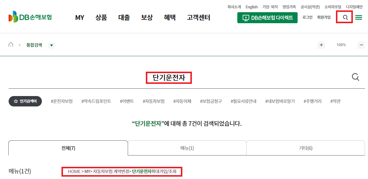 DB손해보험 단기운전자 추가를 위해서는 홈페이지에서 단기운전자 확대가입/조회 메뉴를 찾아야 합니다. 우측 상단에 있는 검색버튼으로 단기운전자를 검색하면 간편하게 검색 결과를 볼수 있습니다.
