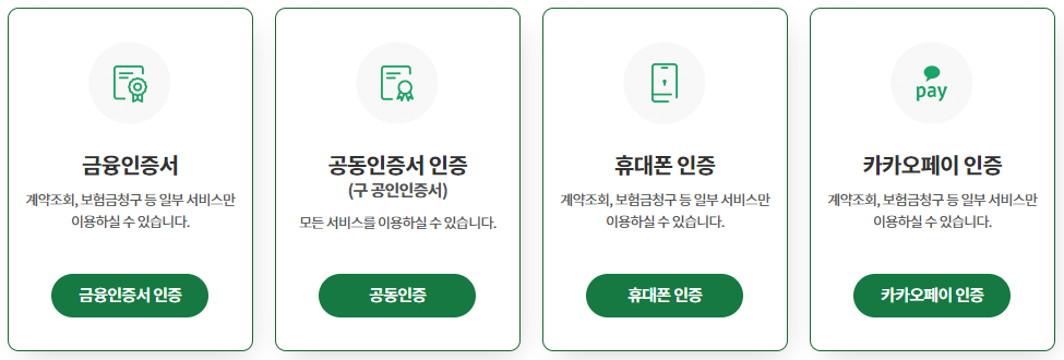 DB손해보험 단기운전자 확대 가입을 위해서는 홈페이지 로그인이 필요합니다. 로그인은 금융인증서, 공동인증서, 휴대폰 인증, 카카오페이 인증의 4가지 방법 중에서 선택을 하면 됩니다.