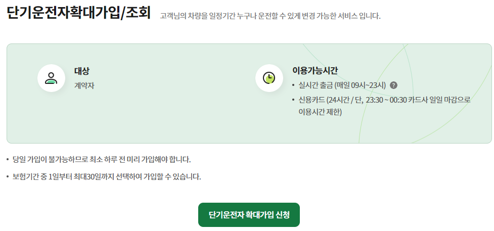 단기운전자확대가입/조회 메뉴를 선택하면 아래와 같이 해당 서비스에 대한 안내를 볼 수 있습니다. 가입 가능 대상은 계약자 본인이어야 하며, 이용가능 시간은 매일 오전 9시부터 오후 11시까지입니다.