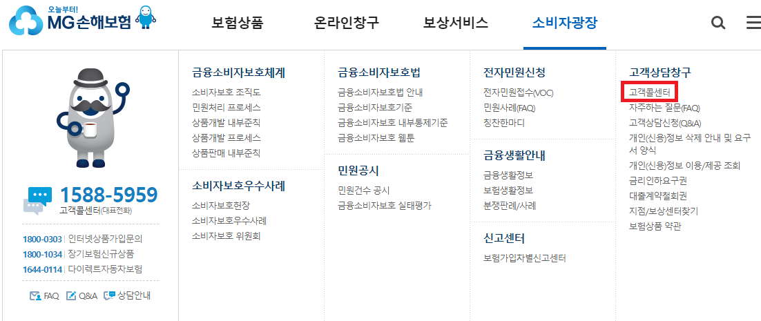 소비자광장 메뉴를 선택하면 고객센터와 관련한 서비스 항목들이 아래와 같이 펼쳐집니다. MG손해보험 고객센터 전화번호를 확인하기 위해서는 고객콜센터를 선택합니다.