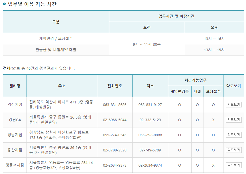 모든 지점과 보상센터의 처리 가능업무가 다르기 때문에 방문전에 미리 한번 더 확인하는 것이 중요합니다. 또한 업무별 이용시간도 다르기 때문에 확인을 하고 방문하는 것이 좋습니다.